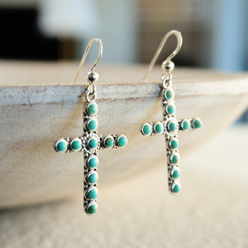 Designed to match our beloved Giada Cross Pendant, these statement earrings bring bold western-boho energy to your look. Each dangling cross charm is adorned with tiny round turquoise stones, creating a vibrant, detailed design that feels both rustic and refined. Lightweight enough for all-day wear but striking enough to turn heads, they’re the perfect finishing touch for a free-spirited, standout style.